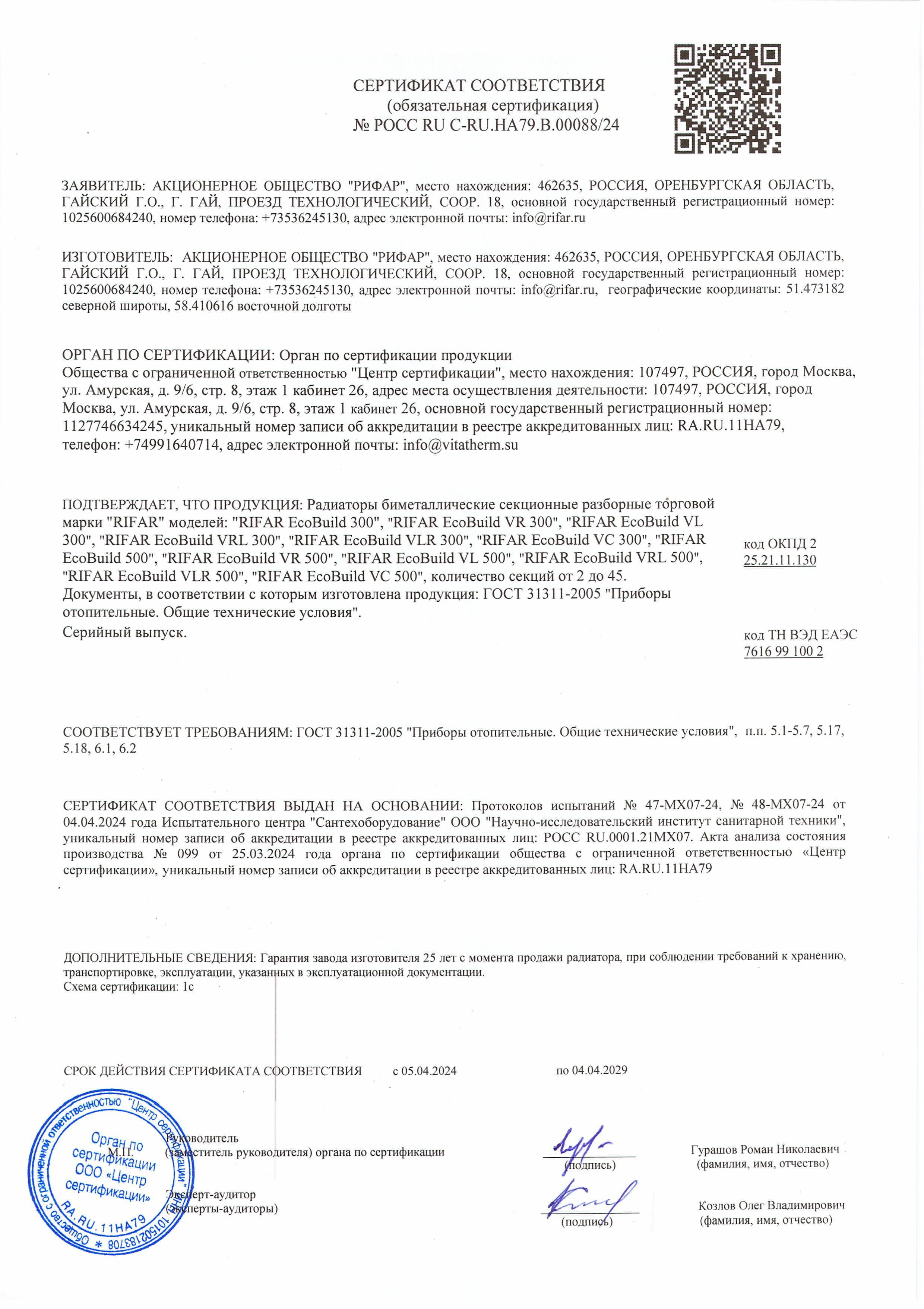 Радиаторы RIFAR ECOBUILD прошли обязательную сертификацию на соответствие требованиям ГОСТ 31311-2005. Вся продукция застрахована СПАО «ИНГОССТРАХ».Технические характеристики одной секции