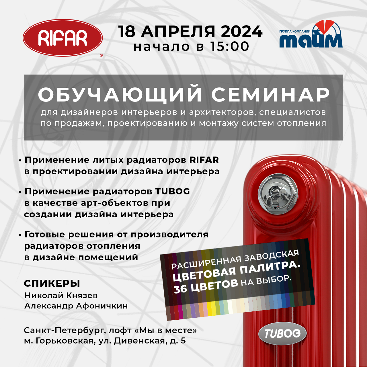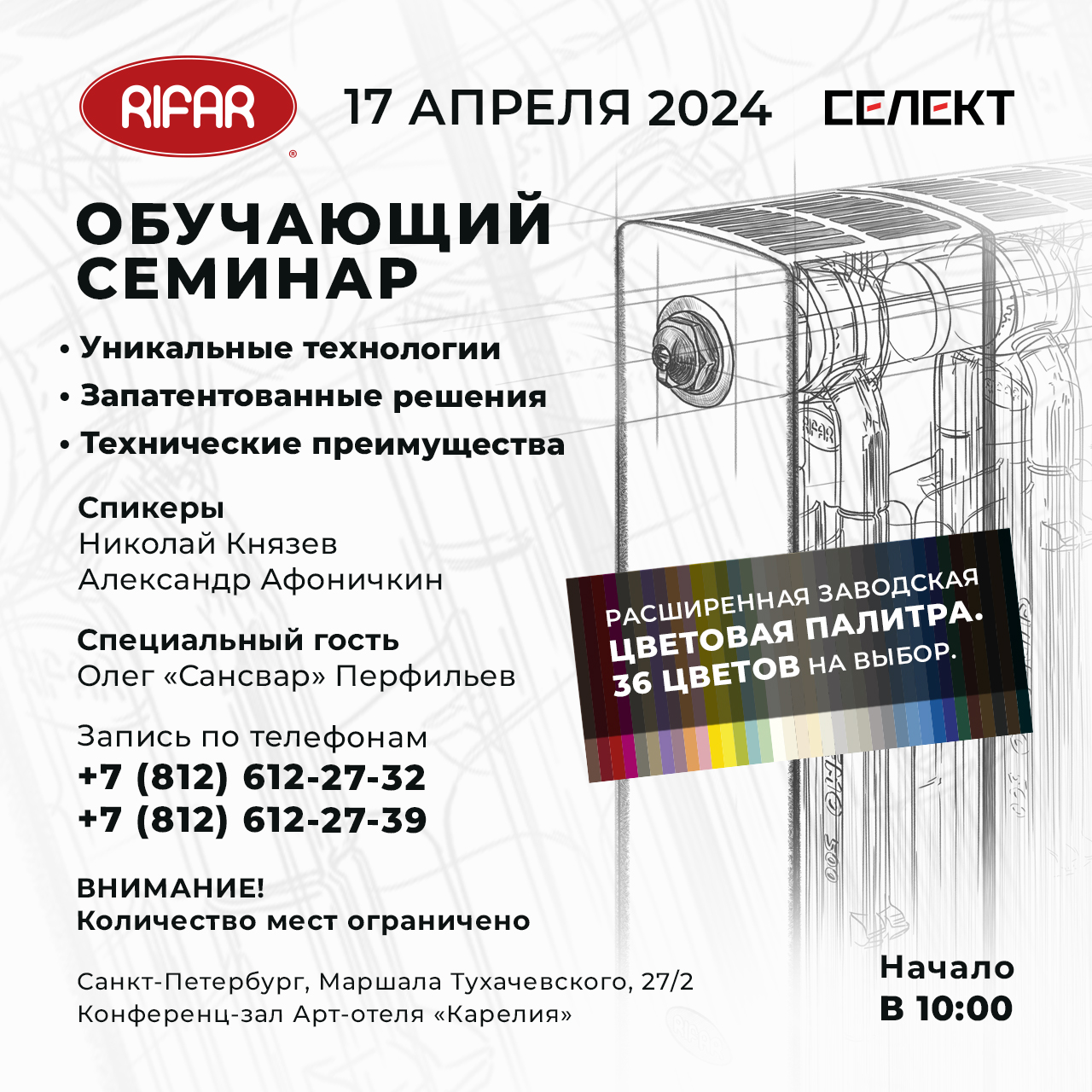 17 и 18 апреля 2024 года, в городе Санкт-Петербург, компания RIFAR, совместно с дилерами завода, компаниями «Селект» и «Тайм», проводит обучающие семинары для дизайнеров интерьеров, архитекторов, специалистов по монтажу и проектированию систем отопления.17 апреля 2024 года, в 10.00, в Арт-отеле «Карелия», совместно с дилером завода, компанией "Селект", состоится семинар RIFAR для специалистов по монтажу и проектированию систем отопления.