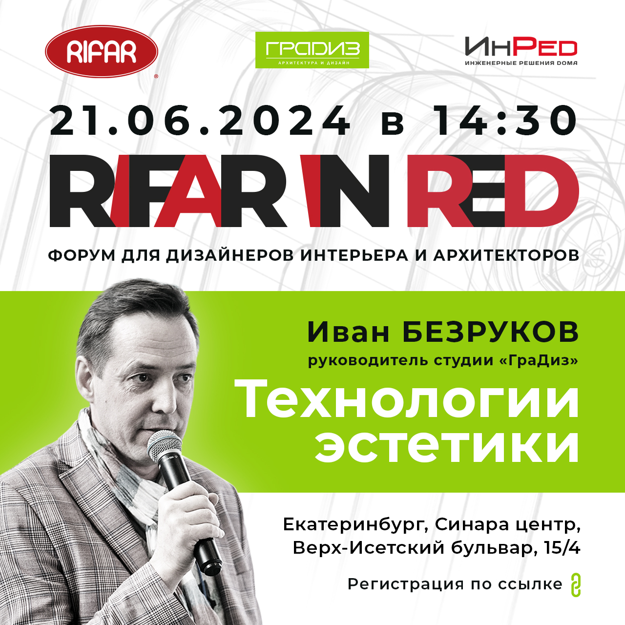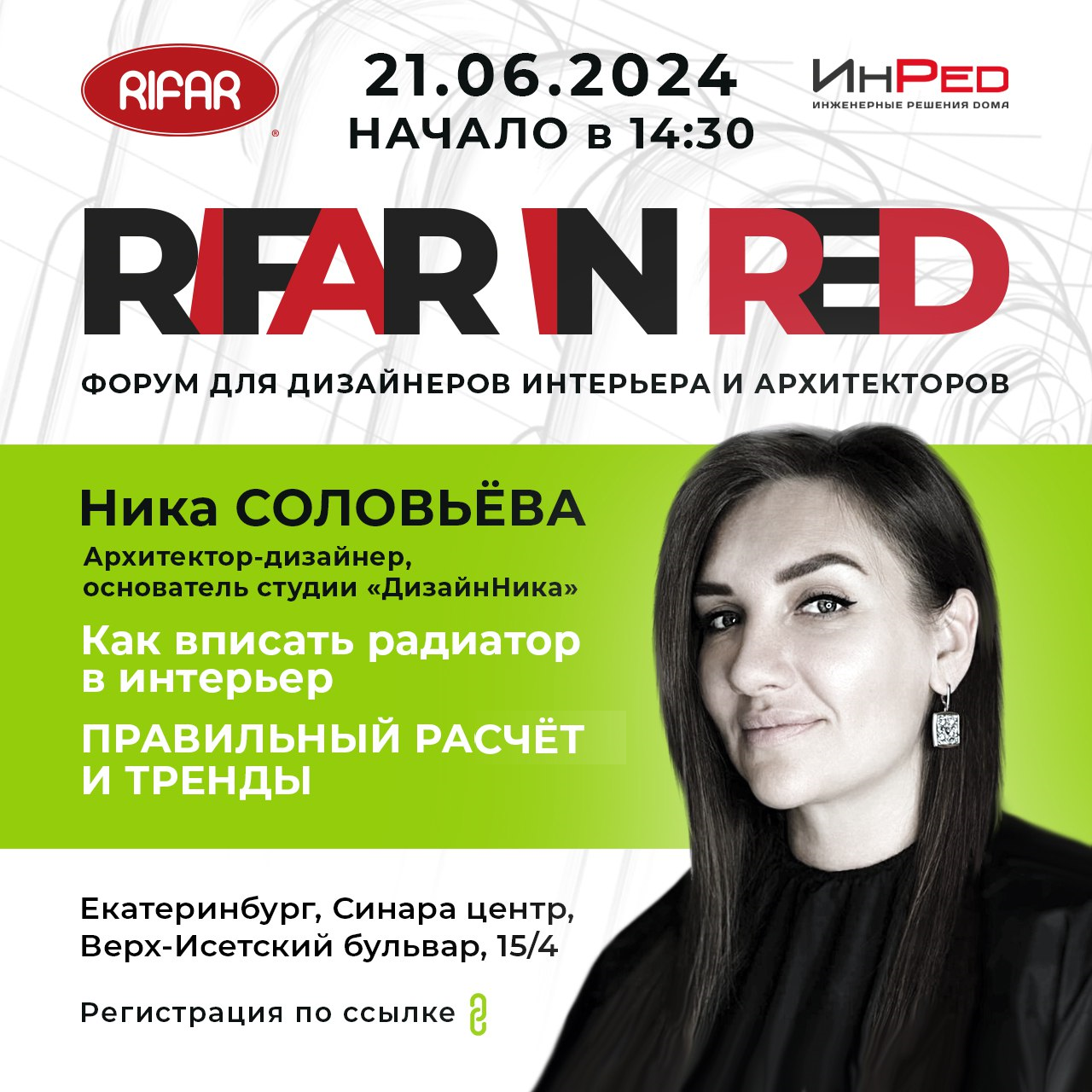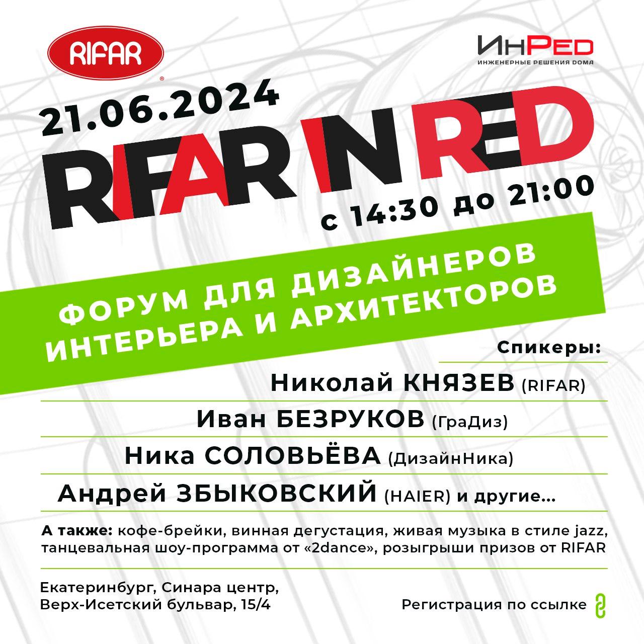 21 июня 2024 года в Екатеринбурге, в культурно-выставочном комплексе «Синара-центр», состоится форум для дизайнеров интерьера и архитекторов RIFAR IN RED. Мероприятие организовано Инженерным центром «ИНРЕД» и компанией RIFAR, ведущим российским производителем радиаторов отопления.На форуме выступят профессионалы и эксперты в области дизайна, архитектуры, отопительных и климатических инженерных решений. Также гостей ждут розыгрыши ценных призов, винная дегустация от профессионального сомелье, живая музыка в стиле Jazz, танцевальное шоу и фуршет.