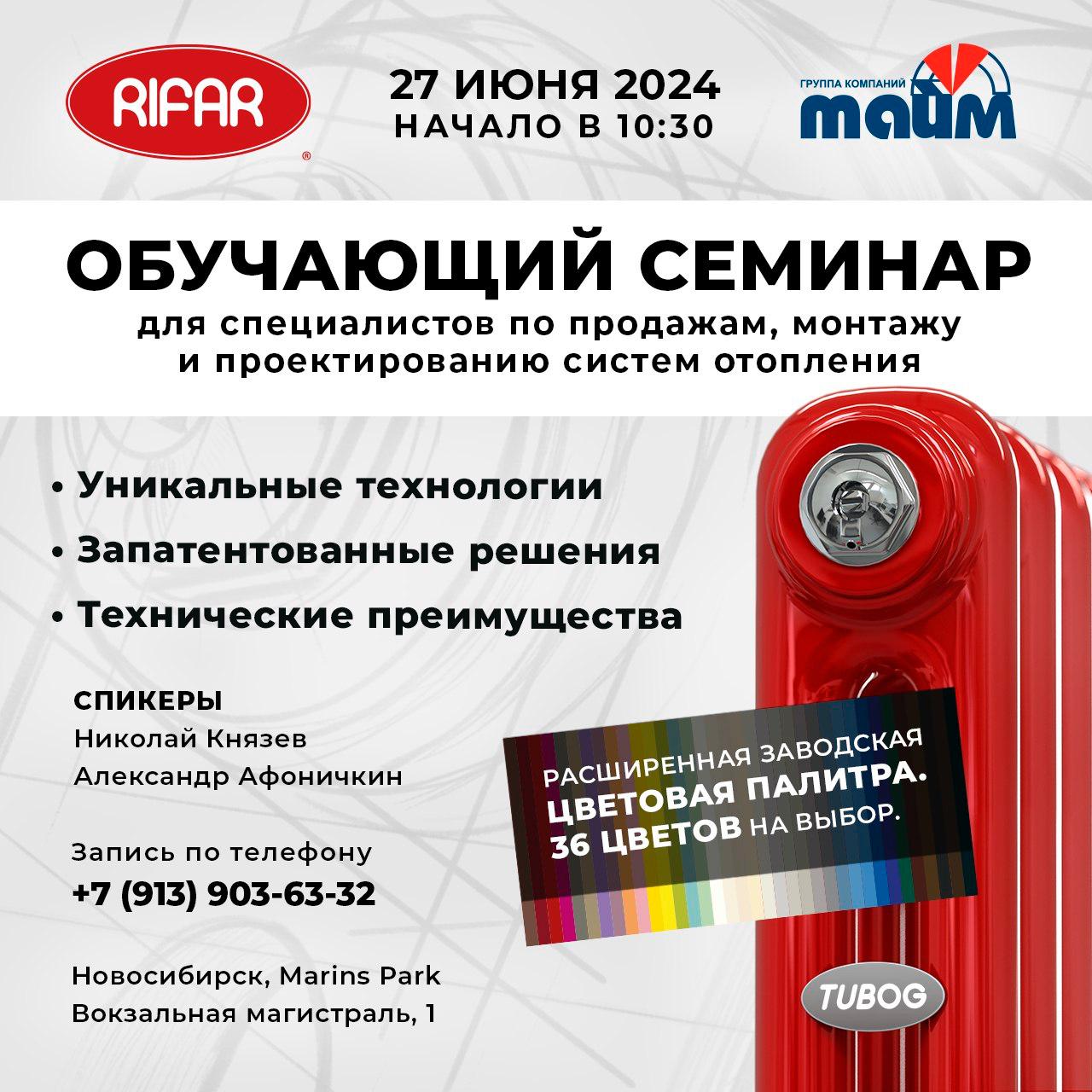 27 июня 2024 года, в 10.30, в конференц-зале Marins Park Hotel Новосибирск, совместно с официальным дилером RIFAR, компанией "Тайм", состоится семинар RIFAR для специалистов по монтажу и проектированию систем отопления.