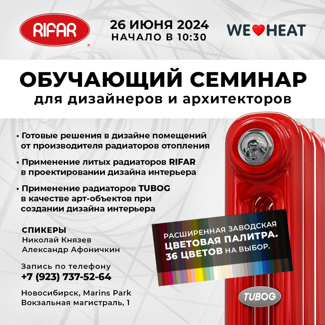 26 и 27 июня 2024 года, в городе Новосибирск, компания RIFAR проводит обучающие семинары для дизайнеров интерьеров, архитекторов, специалистов по монтажу и проектированию систем отопления. Мероприятия проходят при поддержке фирменного центра продаж - компании "WE HEAT" и официального дилера завода, компании «Тайм».26 июня 2024 года, в 10.30, в конференц-зале Marins Park Hotel Новосибирск, совместно с фирменным центром продаж RIFAR - компанией "WE HEAT", состоится предметный семинар, направленный прежде всего на аудиторию дизайнеров интерьеров и архитекторов.