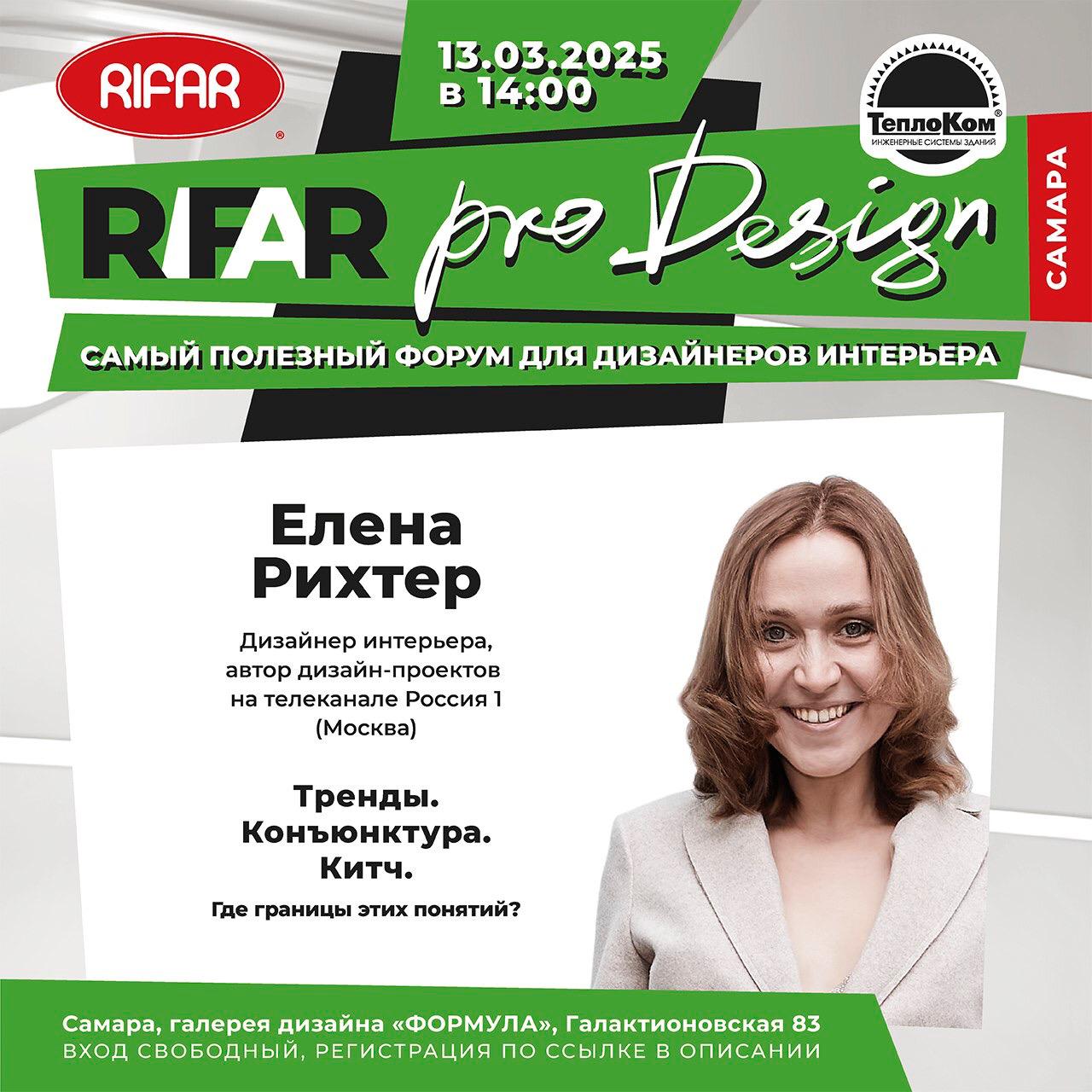13 марта 2025 года, в Самаре, в галерее дизайна "Формула" состоится очередной дизайн-форум "RIFAR Pro Design. Самара". Это уникальный формат мероприятия, представляющий собой микс важных, актуальных и интересных тем, традиционно собирающий профессиональную аудиторию дизайнеров интерьера, декораторов и архитекторов.На сегодняшний день, это самый полезный форум, на котором спикеры делятся актуальными знаниями и новыми компетенциями, повышающими профессиональный уровень участников, и увеличивающими эстетическую, инженерную, технологическую и юридическую ценность их проектов.